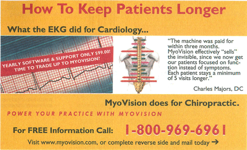In another ad, Dr. Majors says that “since purchasing MyoVision, each patients is staying a minimum of 5 visits longer. Another ad says the test is “like GPS for chiropractic.”