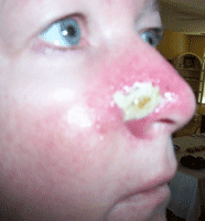 Surgery was recommended, but her sister, who has practiced as a “master herbalist” for many years, persuaded her that a bloodroot paste would do a better job. The picture to the left shows how her nose and the surrounding skin became inflamed. The picture to the right shows the hole in her nose that resulted. The paste destroyed some areas of bone and cartilage, which meant that when the wound healed, she required extensive plastic surgery. She also reported that the inflamed area was extremely painful for more than a week.